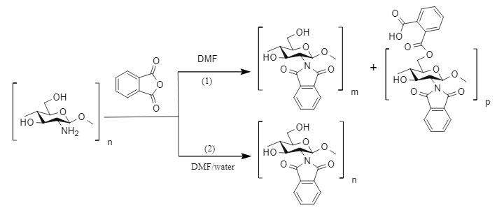 栗田らは、キトサンのアミノ基を保護する際に、5%の水を含むDMF溶液中、120℃で無水フタル酸を用いてPht保護基を導入し、80%を超える収率を達成した。この条件下では、水酸基に影響を与えずにアミノ基を選択的に保護することができる(経路2)。また、栗田らは、純粋なDMF中で反応を行うと、アミノ基と水酸基の両方が保護された副生成物が得られることを明らかにした(経路1)。