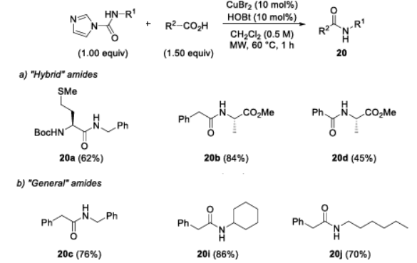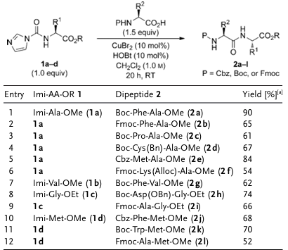 2 )の存在下でN保護アミノ酸と直接反応し、52~90%の収率でジペプチドが得られる。この方法は、Fmoc、Boc、Cbzなどの一般的に使用されるカルバメート保護基と互換性があり、反応基質が容易にラセミ化するシステインを含む場合でもラセミ化は観察されなかった。しかし、研究によると、従来のペプチド合成溶媒であるDMFはこのシステムには適していない。