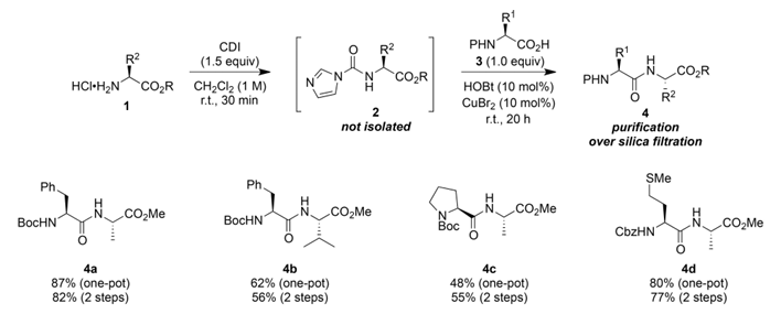 カンパーニュ氏(J.-M.)の研究チームは、これまでの研究成果を基に合成戦略をさらに最適化し、ジペプチドを合成するためのワンポット法を開発した。この方法は、穏やかな中性条件下で実施でき、アルカリ剤を必要とせず、N-イミダゾリウムカルボキシルアミノ酸エステル中間体をその場で生成する。分離精製の必要がないため、これらの中間体は市販の保護アミノ酸と直接反応させることができ、操作プロセスを大幅に簡素化できる。