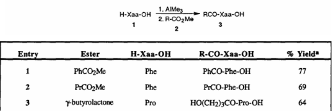 2. SFのマーティンのチームは、トリメチルアルミニウムを用いてアミノ酸エステルと遊離アミノ酸の反応を促進し、ペプチド結合を形成する方法を開発した。この方法は、カルボン酸エステルまたはN保護アミノ酸エステルを求電子剤として用い、遊離アミノ酸またはジペプチドと直接結合させることで、良好な収率を達成する。しかし、ペプチド鎖をさらに延長してトリペプチドやテトラペプチドを合成しようとすると、著しいラセミ化が起こり、長鎖ペプチドの合成への応用が制限される。