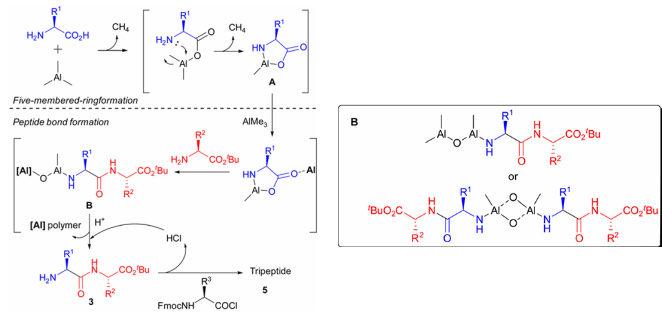 その作用機序は以下のとおりです。まず、トリメチルアルミニウムが遊離アミノ酸と反応してカルボキシル基を活性化し、メタンを放出します。次に、分子内アミノ基と反応して5員環中間体Aを形成し、2分子目のメタンを放出します。その後、別のトリメチルアルミニウム分子の触媒作用により、新たに添加されたアミノ酸エステルが中間体Aを攻撃して開環反応を起こし、中間体Bを生成します。最後に、酸処理によってアミノ基が放出され、ジペプチド生成物が得られます。