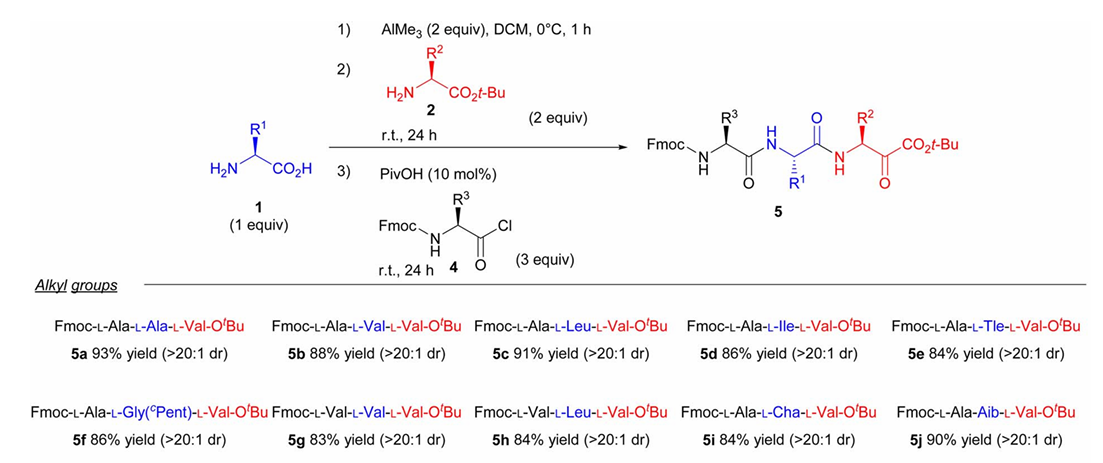 研究チームは、反応条件を検討するためのモデル反応としてトリペプチド合成を用いた。最終的に、溶媒としてジクロロメタンを使用し、遊離アミノ酸とトリメチルアルミニウムを低温(0 ℃ )で予め混合してカルボキシル基を活性化することが最適であると判断した。次に、トリペプチドを室温でアミノ酸メチルエステルとアミド化反応させ、ペンチル酸で酸処理してアミノ基を完全に遊離させた。最後に、Fmoc基と反応させてアミノアシルクロリドを保護することで、トリペプチドを得た。